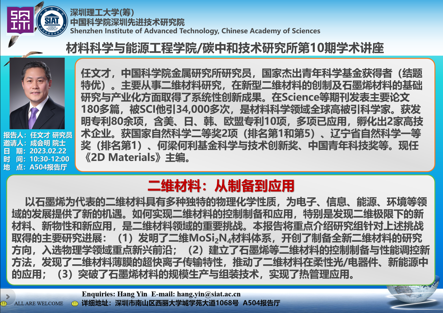 材料科学与能源工程学院/碳中和技术研究所第10期学术讲座将于2月22日(周三)10:30-12:00在A504报告厅召开。本次讲座特邀中国科学院金属研究所 任文才 研究员 作题为《二维材料:从制备到应用》的学术报告。 会议由碳中和所的成会明 院士主持,诚挚邀请大家准时参加、学习和交流!