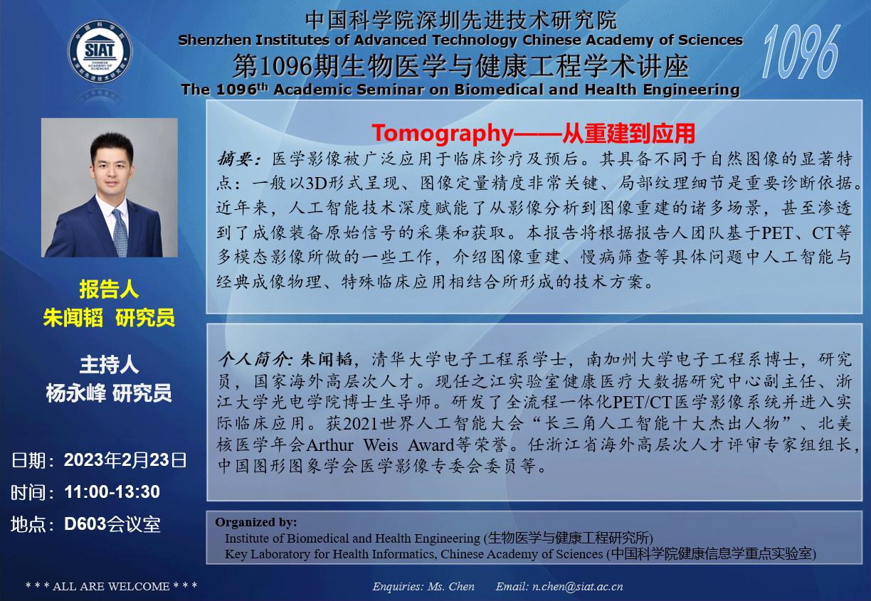 医工所第1096期学术讲座将于 2023年2月23日(周四)11:00-13:30 在D603会议室举行。