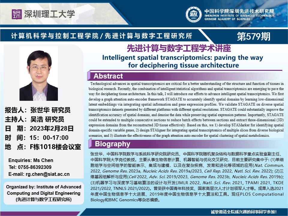 计算机学院/先进计算与数字工程研究所学术讲座第579期将于2月28日15:00-17:00在F栋1018会议室举行,本次讲座将邀请中国科学院数学与系统科学研究院 张世华 研究员作题为“Intelligent spatial transcriptomics: paving the way for deciphering tissue architecture”的报告。本次报告将由数字所 吴浩 研究员主持,诚挚邀请大家参加、学习和交流!