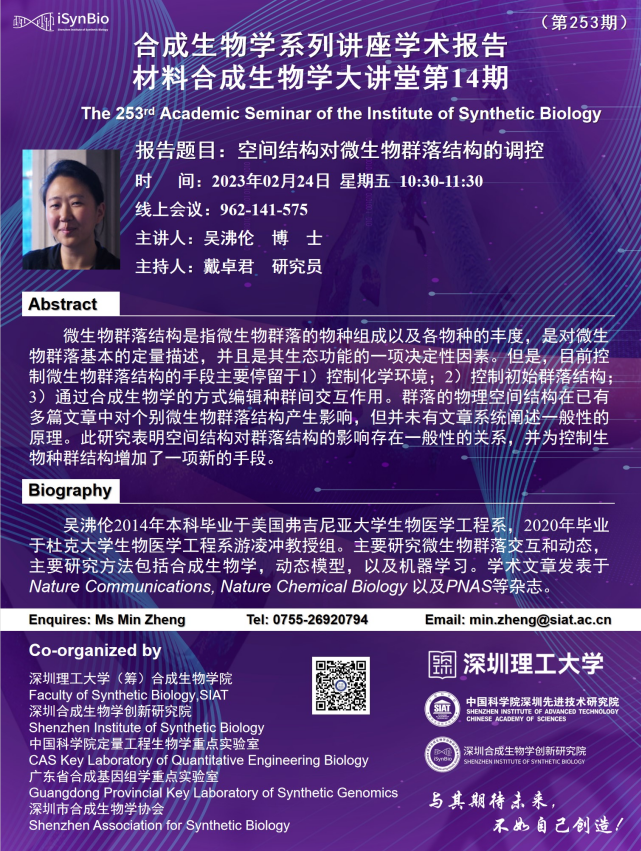 合成所/合成生物学院第253期学术讲座将于 2月24日(周五)10:30-11:30 在 腾讯会议:962 141 575 举行。
