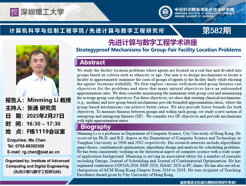 大家好!计算机学院/先进计算与数字工程研究所学术讲座第582期将于2月27日16:30 – 17:30在F1119会议室举行,本次讲座将邀请香港城市大学 Minming Li 教授作题为“Strategyproof Mechanisms for Group-Fair Facility Location Problems”的报告。本次报告将由数字所 张涌 研究员主持,诚挚邀请大家参加、学习和交流!