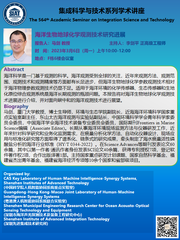 集成所第564期集成科学与技术系列学术讲座将于2023年3月6日(周一)上午10:00-12:00在F栋6楼会议室召开,本次讲座特邀厦门大学的马剑 教授作题为《海洋生物地球化学观测技术研究进展》的学术报告。