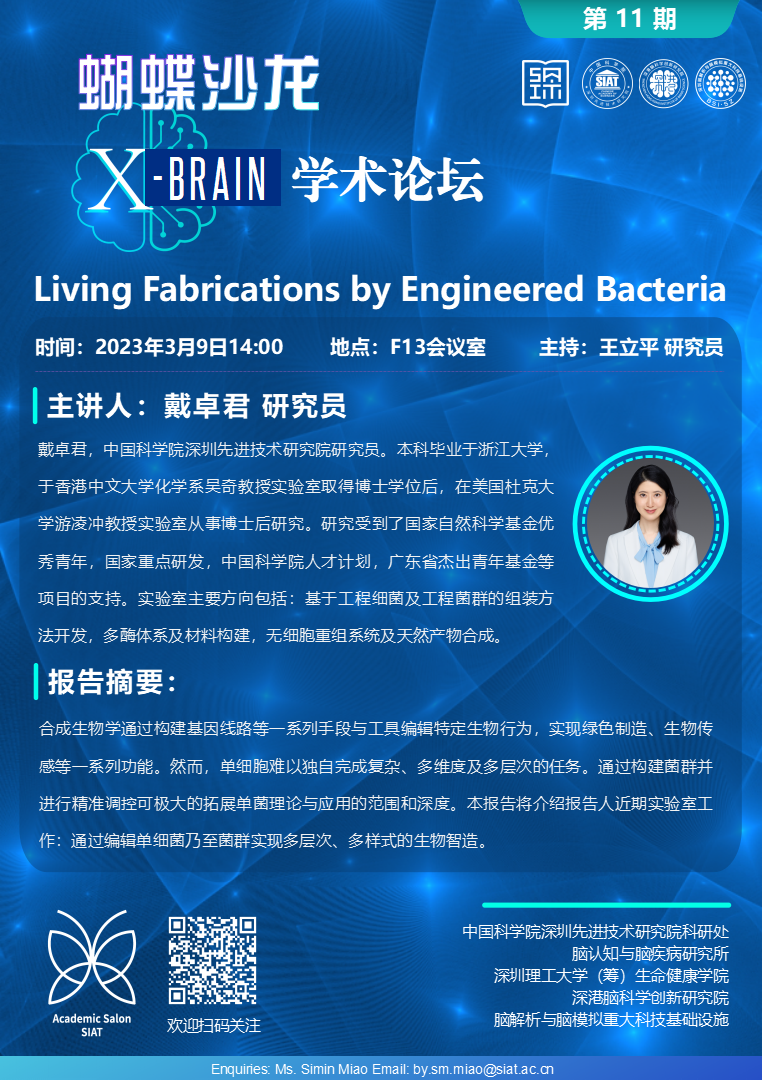 本次论坛由合成所,戴卓君研究员,带来“Living Fabrications by Engineered Bacteria”的专题报告。