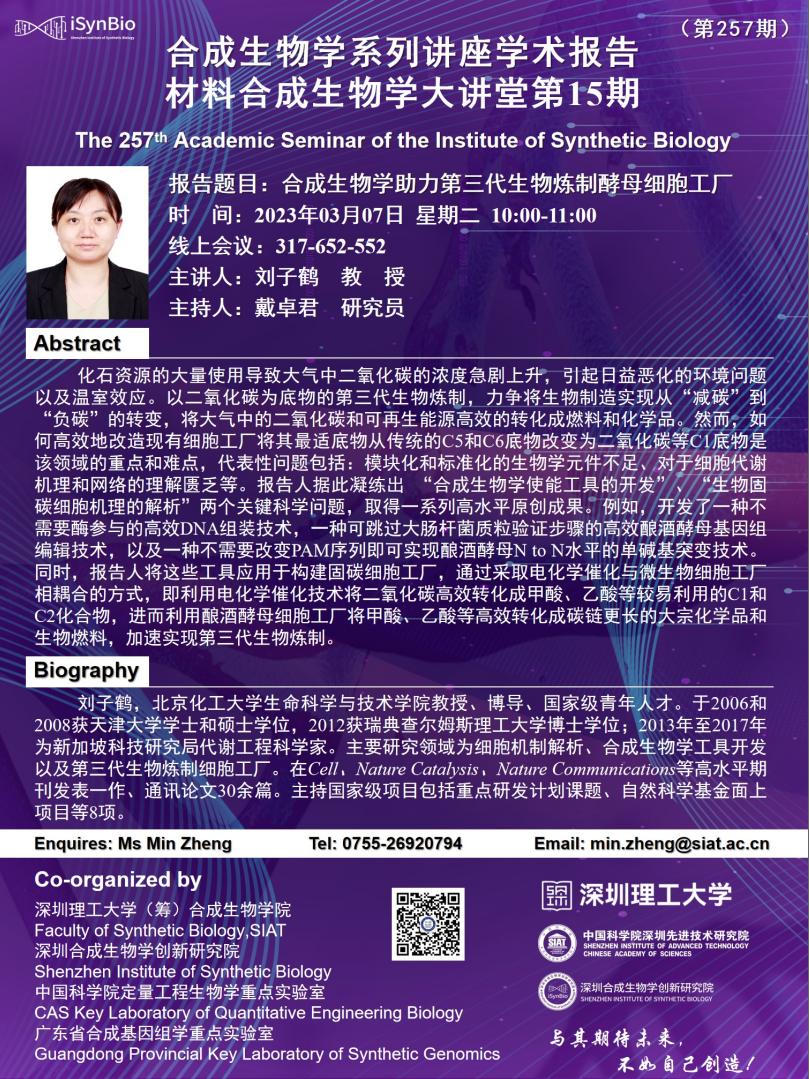 合成所/合成生物学院第257期学术讲座将于 3月7日(周二)10:00-11:00 在 腾讯会议:317 652 552 举行。