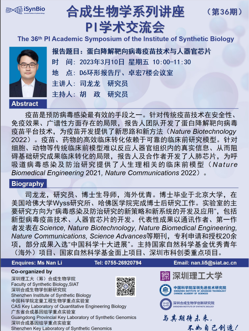 【2023年3月10日 合成所/合成生物学院】蛋白降解靶向病毒疫苗技术与人器官芯片