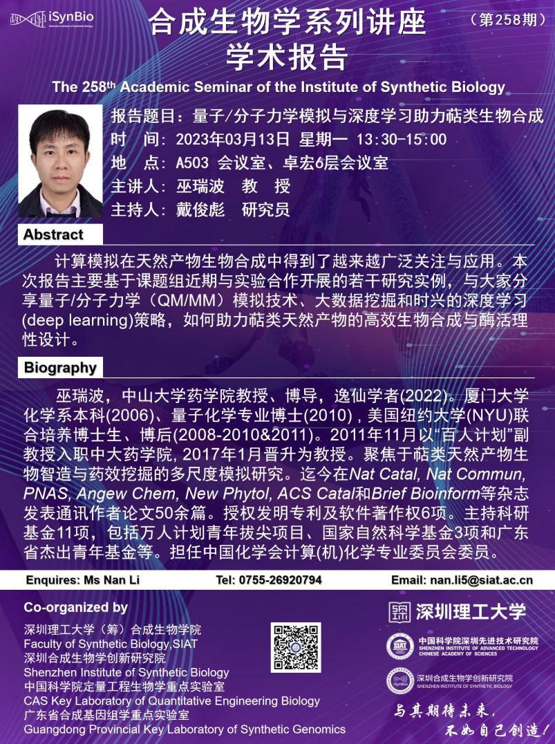 本次讲座邀请了 中山大学 巫瑞波 教授 带来题为“量子/分子力学模拟与深度学习助力萜类生物合”的报告。