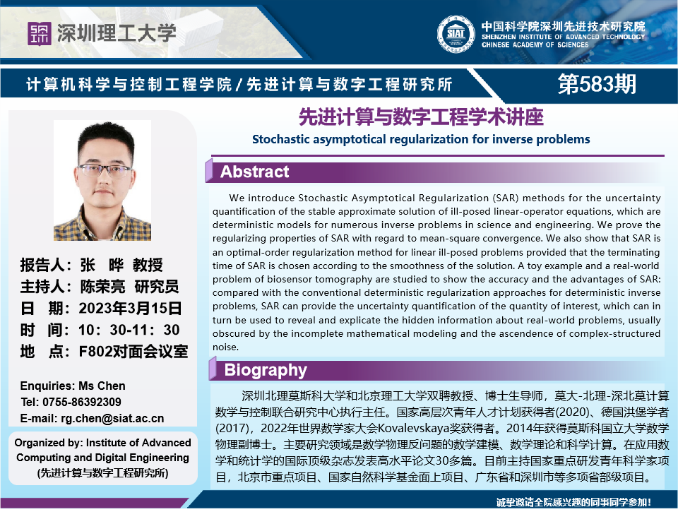 大家好!计算机学院/先进计算与数字工程研究所学术讲座第583期将于3月15日10:30 – 11:30在F802对面会议室举行,本次讲座将邀请深圳北理莫斯科大学和北京理工大学双聘教授 张晔 教授作题为“Stochastic asymptotical regularization for inverse problems”的报告。本次报告将由数字所 陈荣亮 研究员主持,诚挚邀请大家参加、学习和交流!