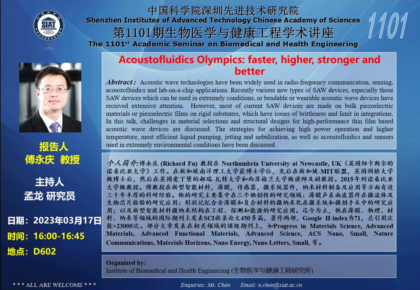 本次讲座邀请了 英国纽卡斯尔的诺桑比亚大学 傅永庆 教授带来题为“Acoustofluidics Olympics: faster, higher, stronger and better”(16:00-16:45)的报告,