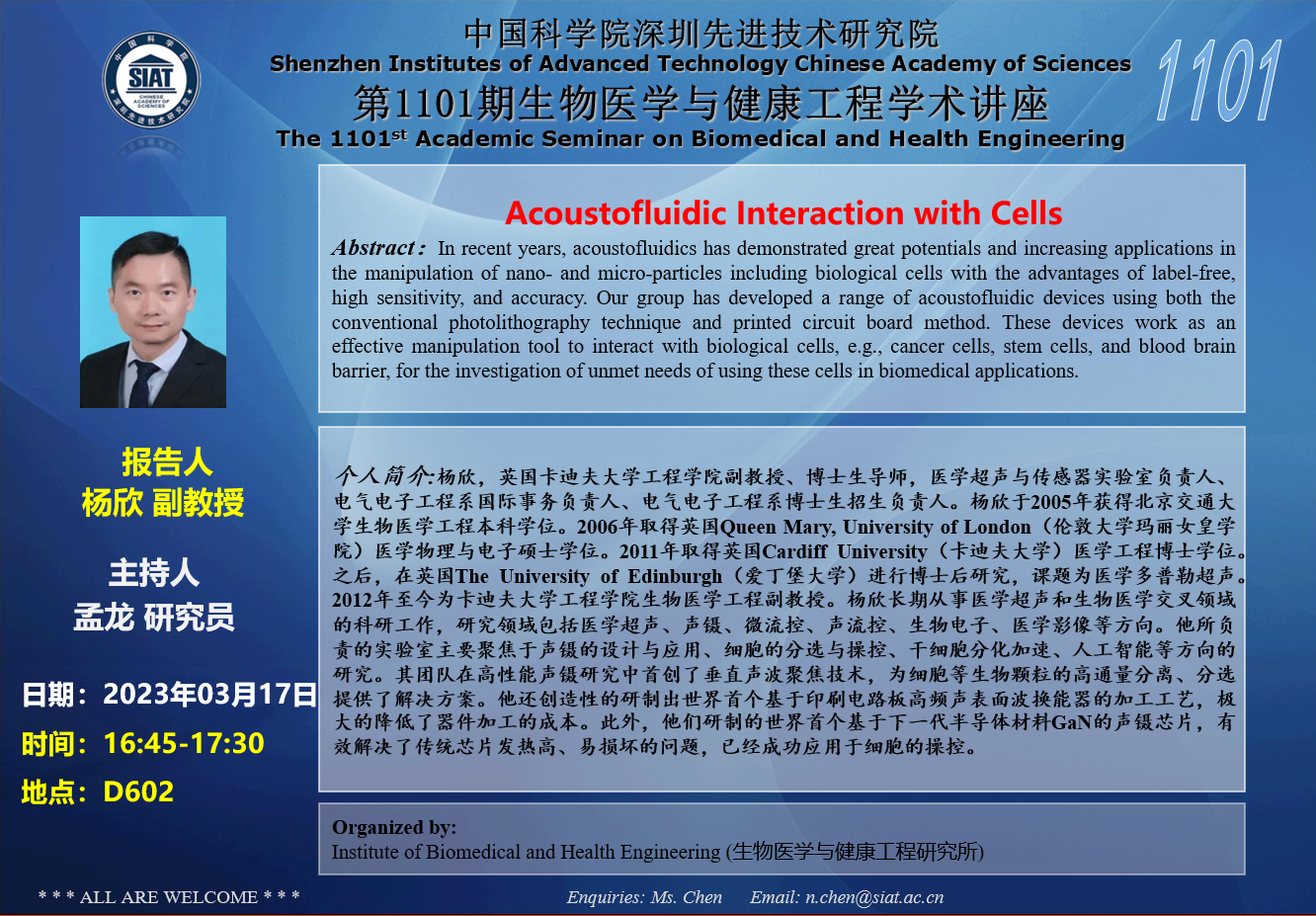以及 英国卡迪夫大学 杨欣 副教授带来题为“Acoustofluidic Interaction with Cells”(16:45-17:30)的报告。