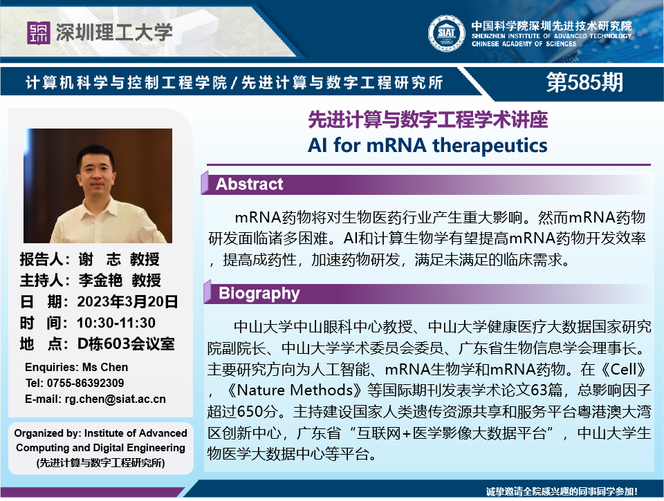 大家好!计算机学院/先进计算与数字工程研究所学术讲座第585期将于3月20日10:30-11:30在D栋603会议室举行,本次讲座将邀请中山大学 谢志 教授作题为“AI for mRNA therapeutics”的报告。本次报告将由计算机学院 李金艳 教授主持,诚挚邀请大家参加、学习和交流!