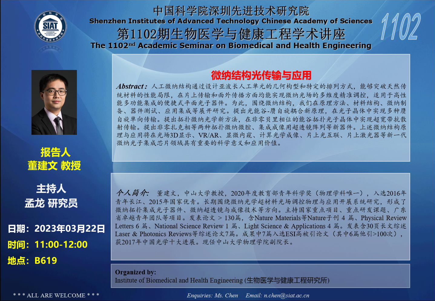 医工所第1102期学术讲座将于 2023年3月22日(周三)11:00-12:00 在B619会议室举行。