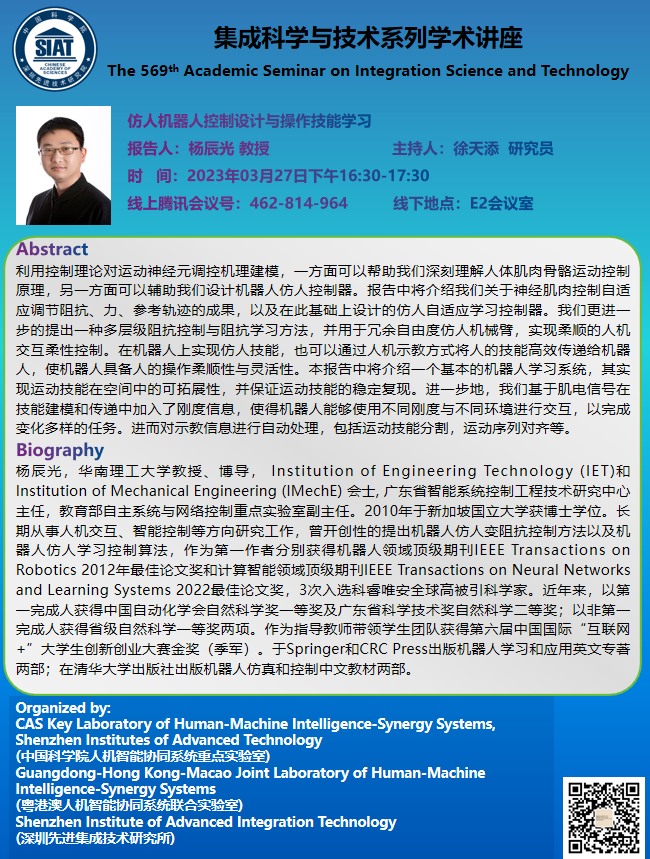 集成所第569期集成科学与技术系列学术讲座将于3月27日(周一)下午16:30-17:30在E栋2楼会议室召开,线上腾讯会议号:462-814-964。本次讲座特邀华南理工大学的杨辰光 教授作题为《仿人机器人控制设计与操作技能学习》的学术报告。