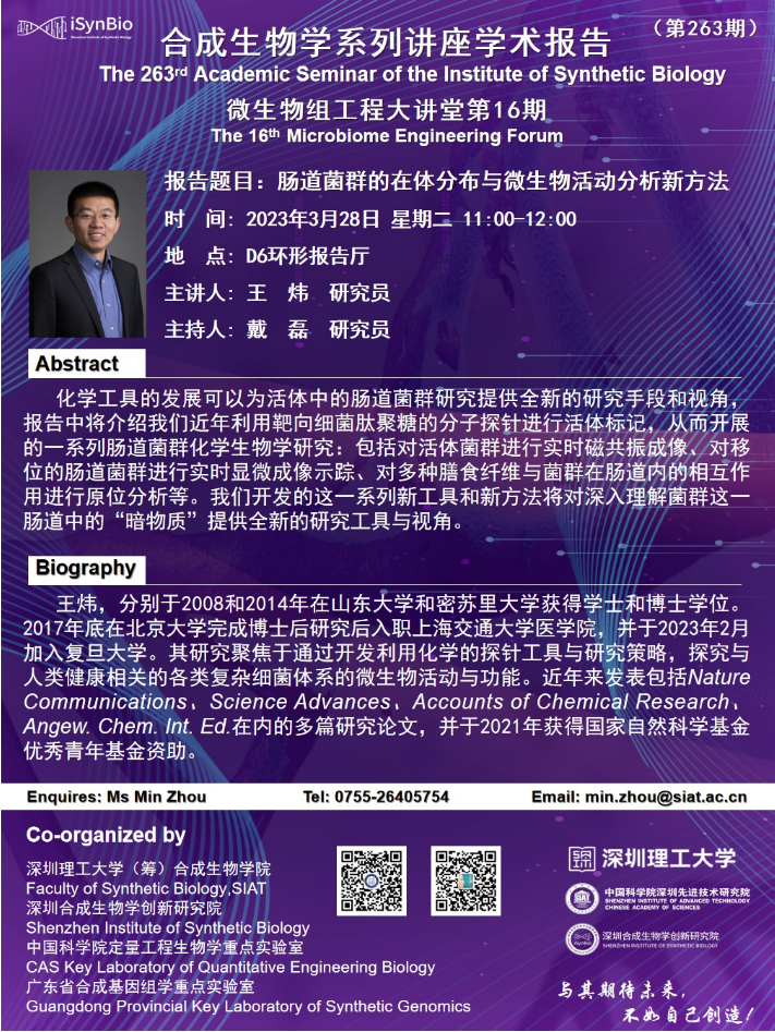 合成所/合成生物学院第263期学术讲座将于 3月28日(周二)11:00-12:00 在 D6环形报告厅 举行。