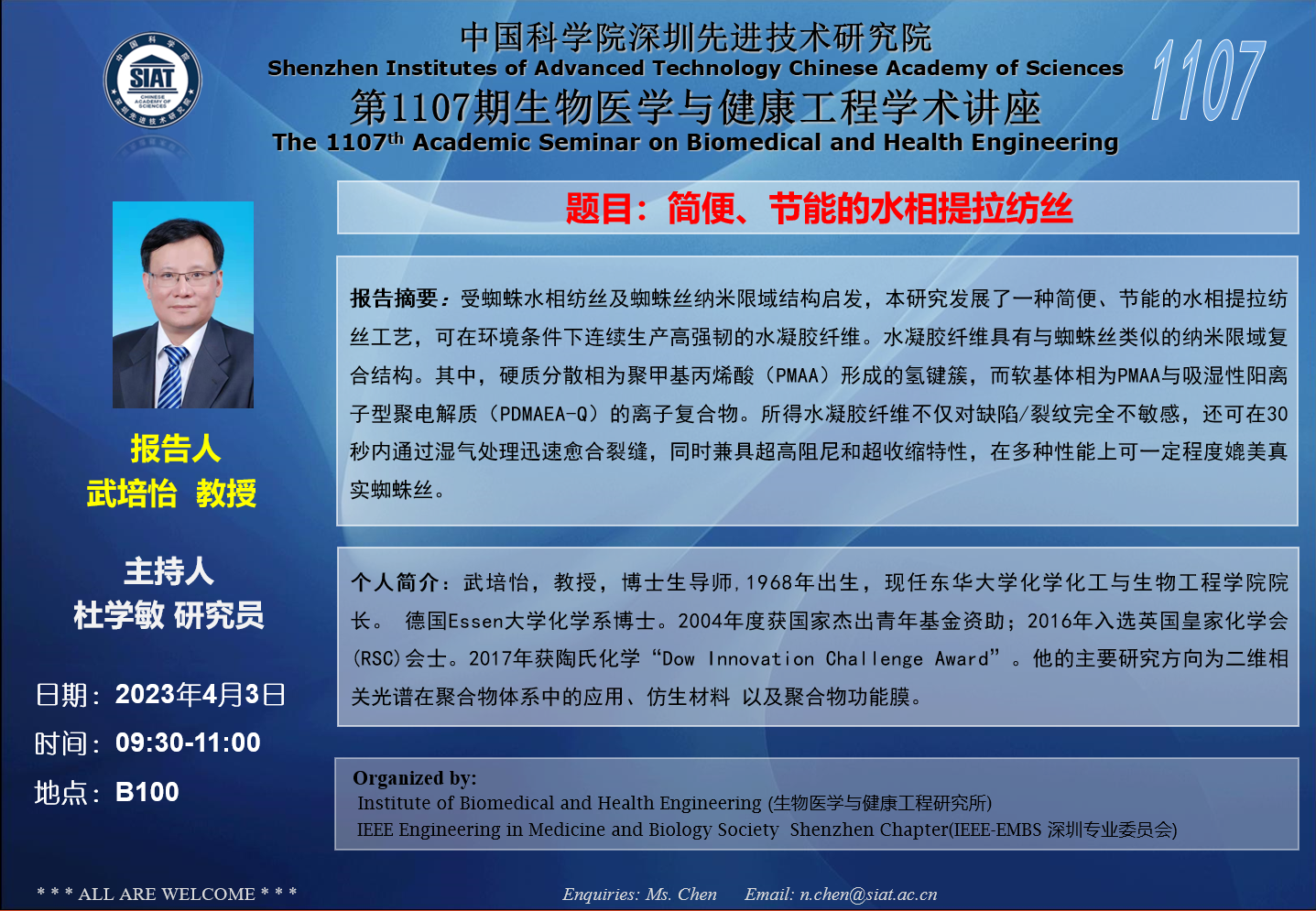 医工所第1107期学术讲座将于 2023年4月3日(周一) 09:30-11:00 在B100会议室举行。