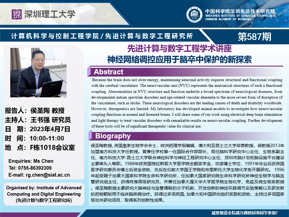 大家好!计算机学院/先进计算与数字工程研究所学术讲座第587期将于4月7日10:00-11:00在F1018会议室举行,本次讲座将邀请南方科技大学 侯圣陶 教授作题为“神经网络调控应用于脑卒中保护的新探索”的报告。本次报告将由数字所 王书强 研究员主持,诚挚邀请大家参加、学习和交流!