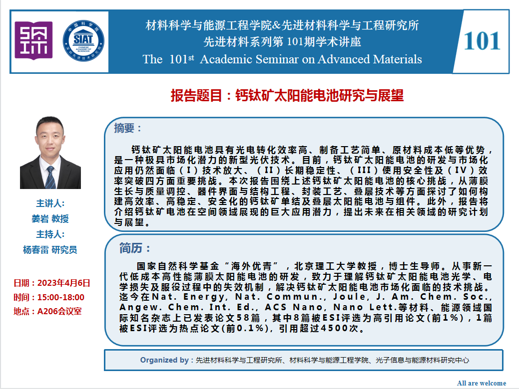 材料科学与能源工程学院 & 先进材料科学与工程研究所“先进材料系列”第101期学术讲座将于04月06日(周四)15:00-18:00,在先进院A206会议室进行。
