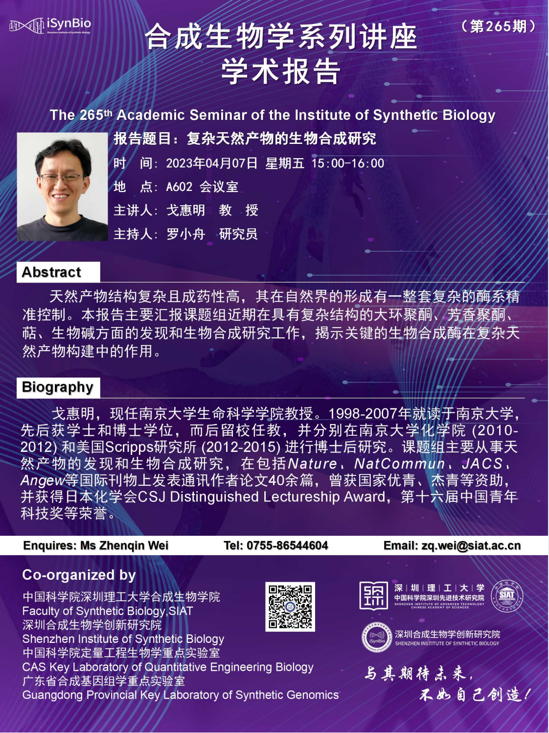 合成所/合成生物学院第265期学术讲座将于 4月7日(星期五)15:00-16:00 在 A602会议室 举行。