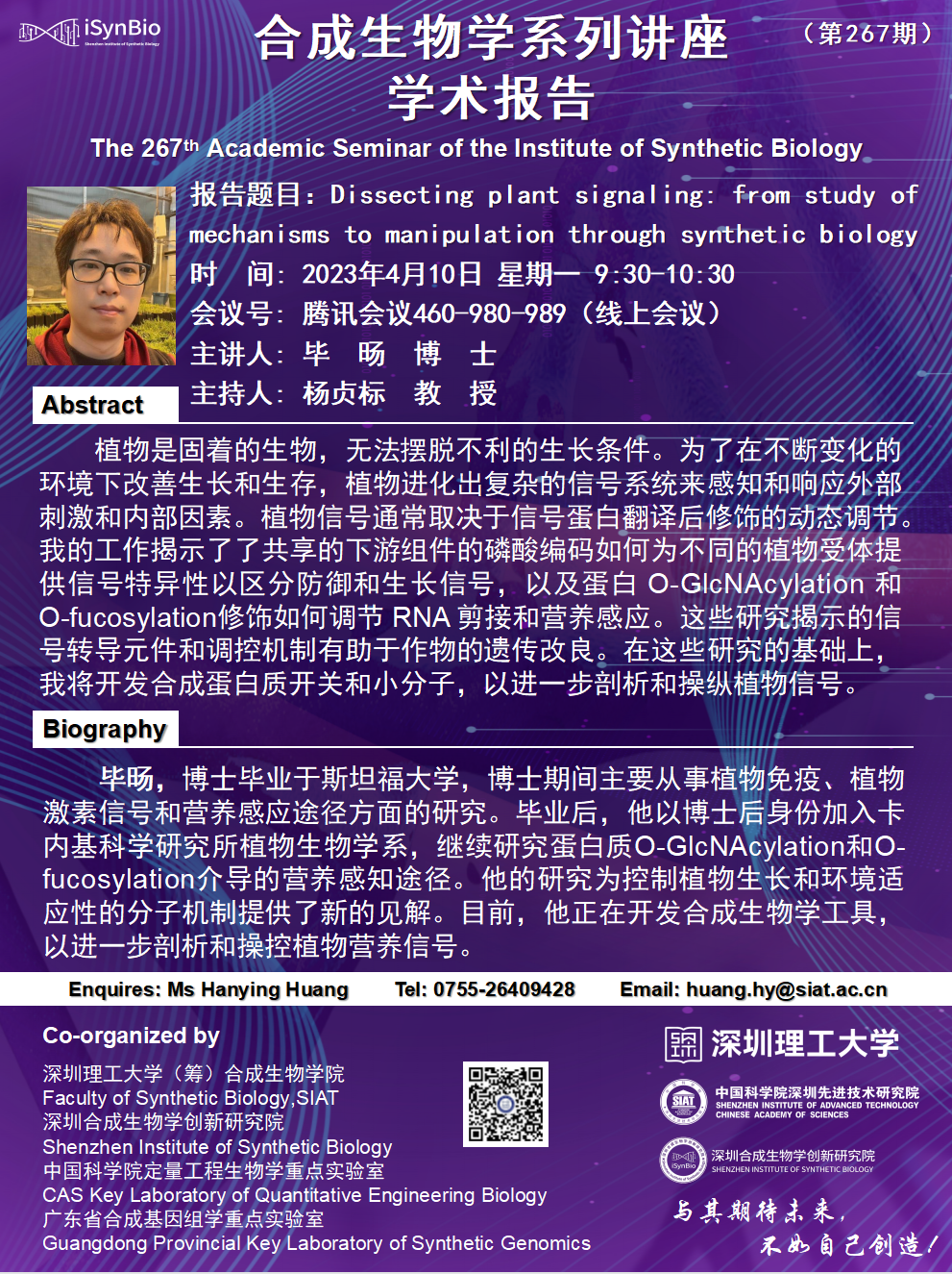合成所/合成生物学院第 267 期学术讲座将于 4月10日(星期一)9:30-10:30 在 腾讯会议:460-980-989 举行。