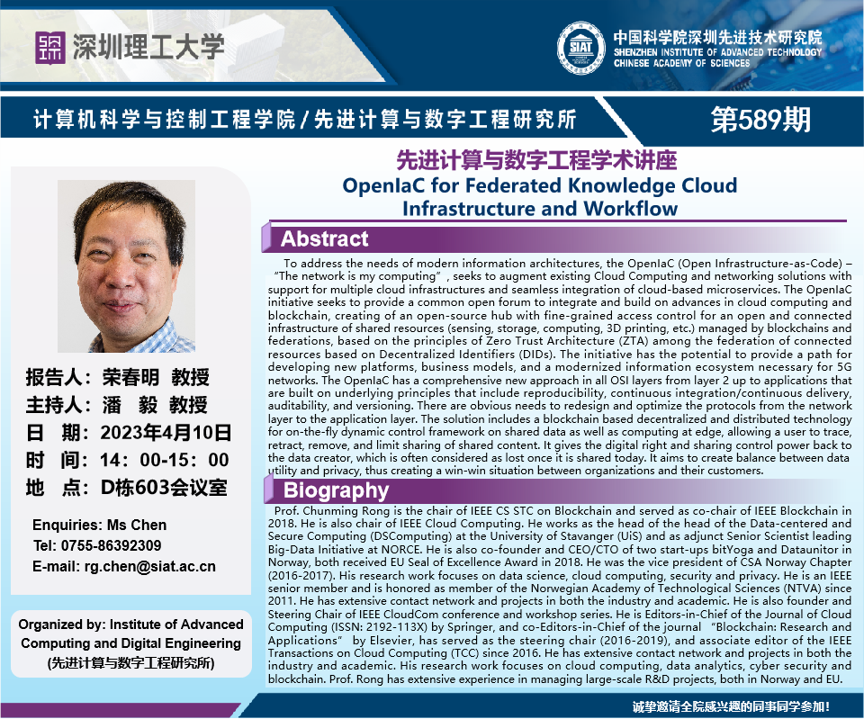 大家好!计算机学院/先进计算与数字工程研究所学术讲座第589期将于4月10日14:00-15:00在D栋603会议室举行,本次讲座将邀请University of Stavanger (UiS) 荣春明 教授作题为“OpenIaC for Federated Knowledge Cloud Infrastructure and Workflow”的报告。本次报告将由计算机学院 潘毅 教授主持,诚挚邀请大家参加、学习和交流!