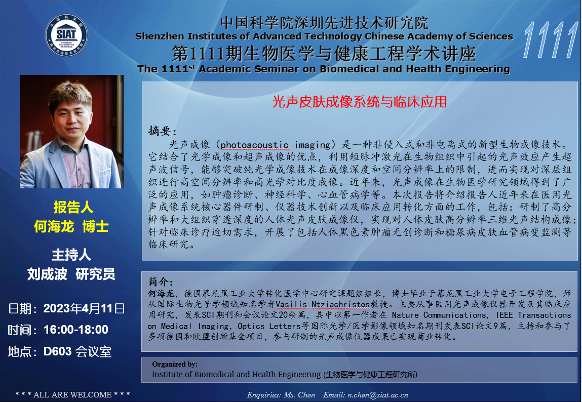 本次讲座邀请了 德国慕尼黑工业大学 何海龙 博士带来题为“光声皮肤成像系统与临床应用”的报告。