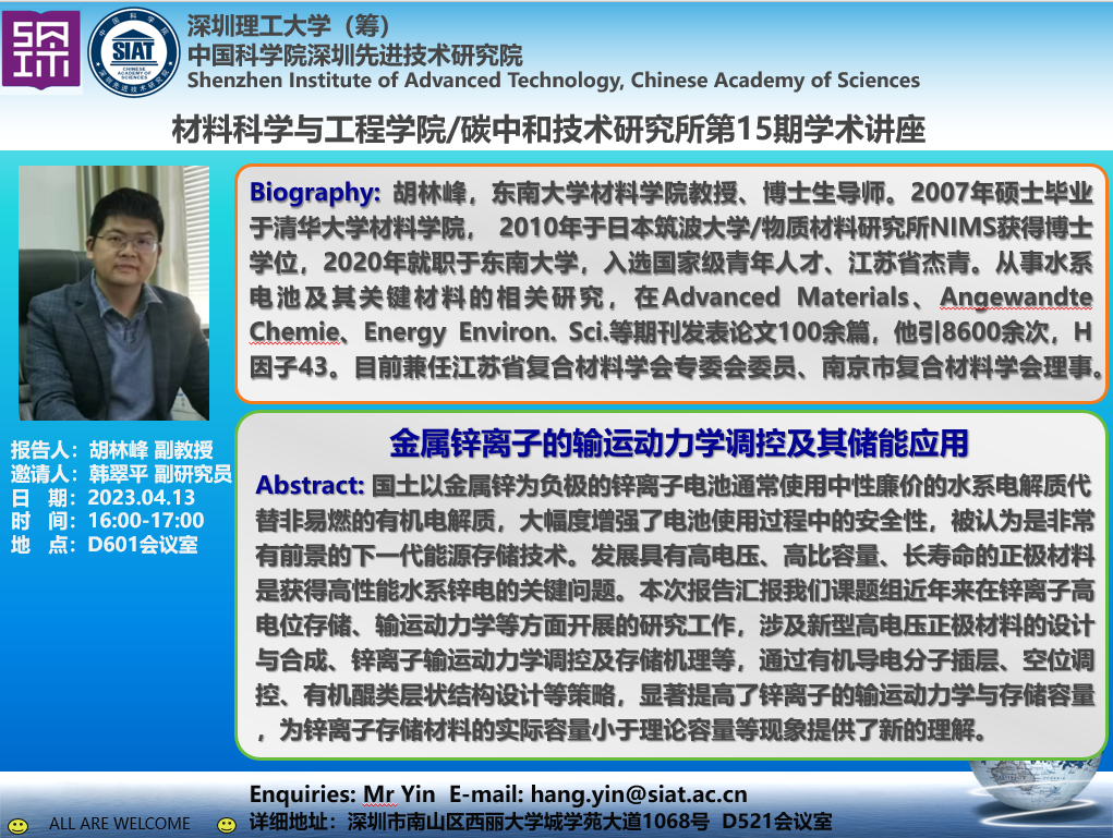 材料科学与能源工程学院/碳中和技术研究所第15期学术讲座将于4月13日(周四)16:00-17:00在D601会议室召开。本次讲座特邀东南大学的胡林峰 副教授作题为《金属锌离子的输运动力学调控及其储能应用》的学术报告。