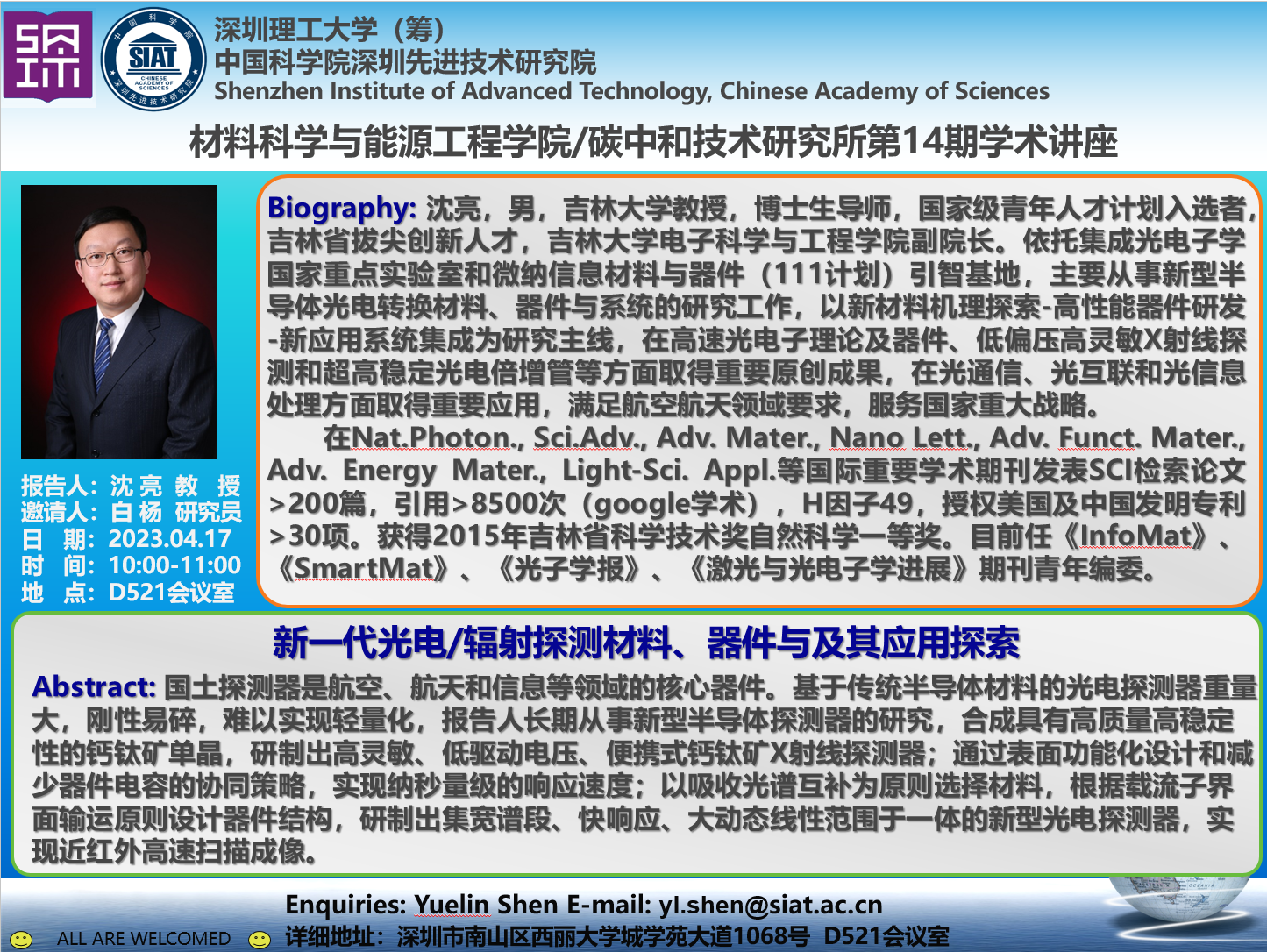 材料科学与能源工程学院/碳中和技术研究所第14期学术讲座将于4月17日(周一)10:00-11:00在D521会议室召开。本次讲座特邀吉林大学的沈亮 教授作题为《新一代光电/辐射探测材料、器件与及其应用探索》的学术报告。