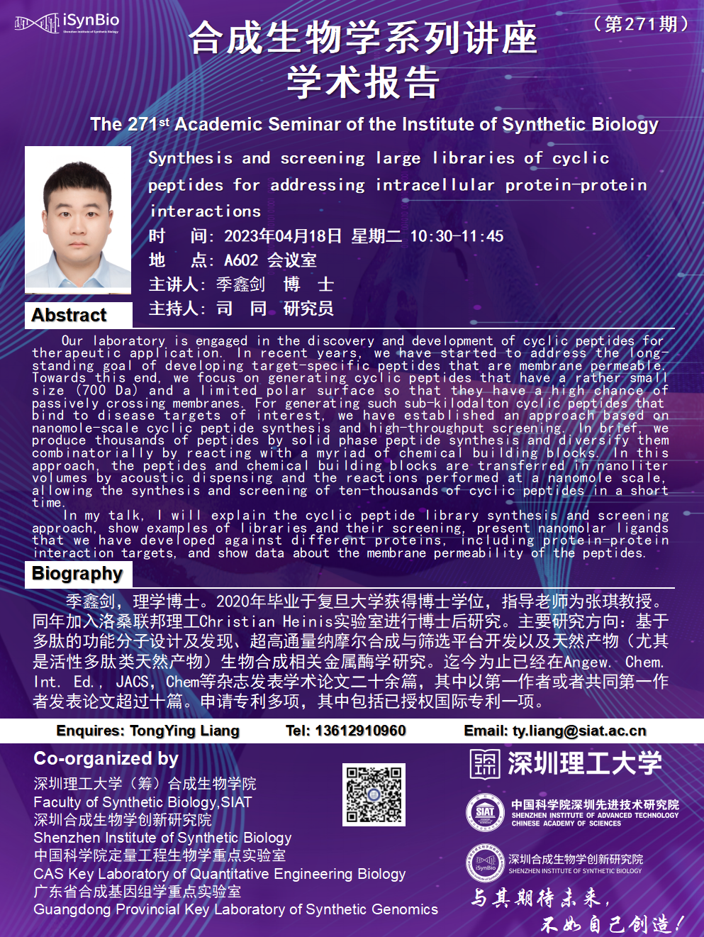 合成所/合成生物学院第 271 期学术讲座将于 4月18日(星期二)10:30-11:45 在 A602会议室 举行。