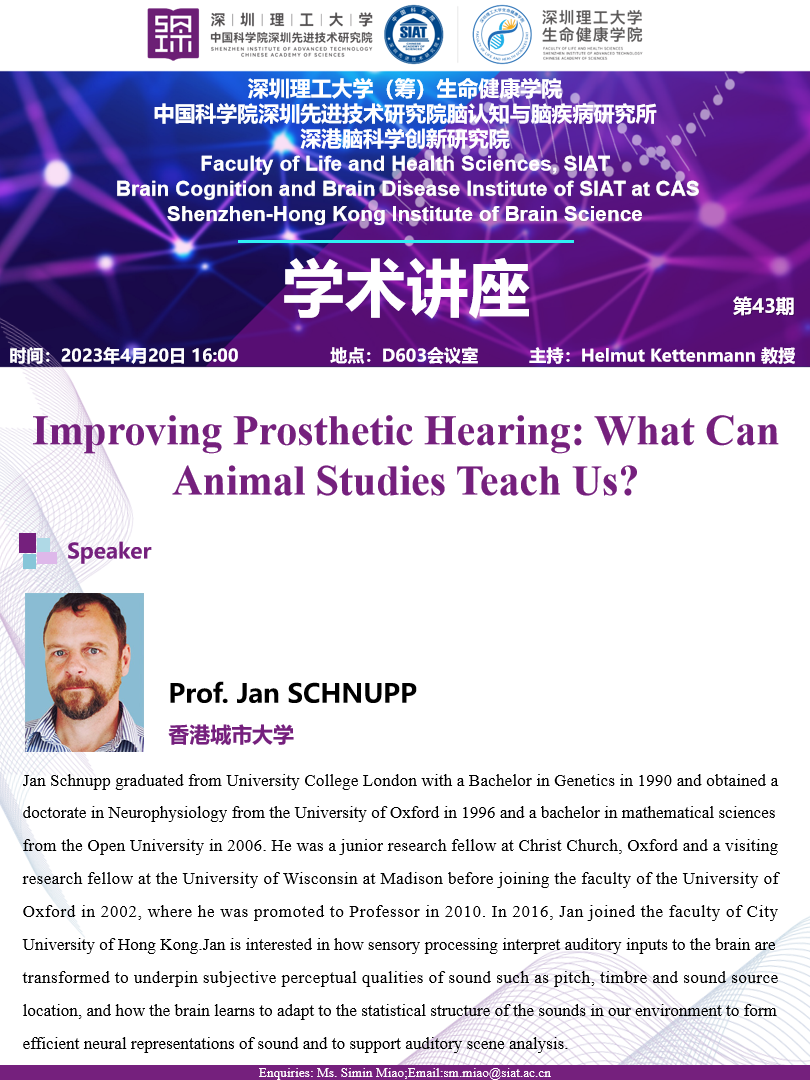 由香港城市大学,Jan SCHNUPP教授,带来“Improving Prosthetic Hearing: What Can Animal Studies Teach Us?”的专题讲座。