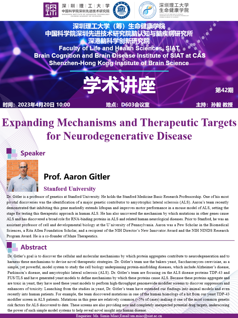 由斯坦福大学 Aaron Gitler教授,带来“Expanding Mechanisms and Therapeutic Targets for Neurodegenerative Disease”的专题讲座。
