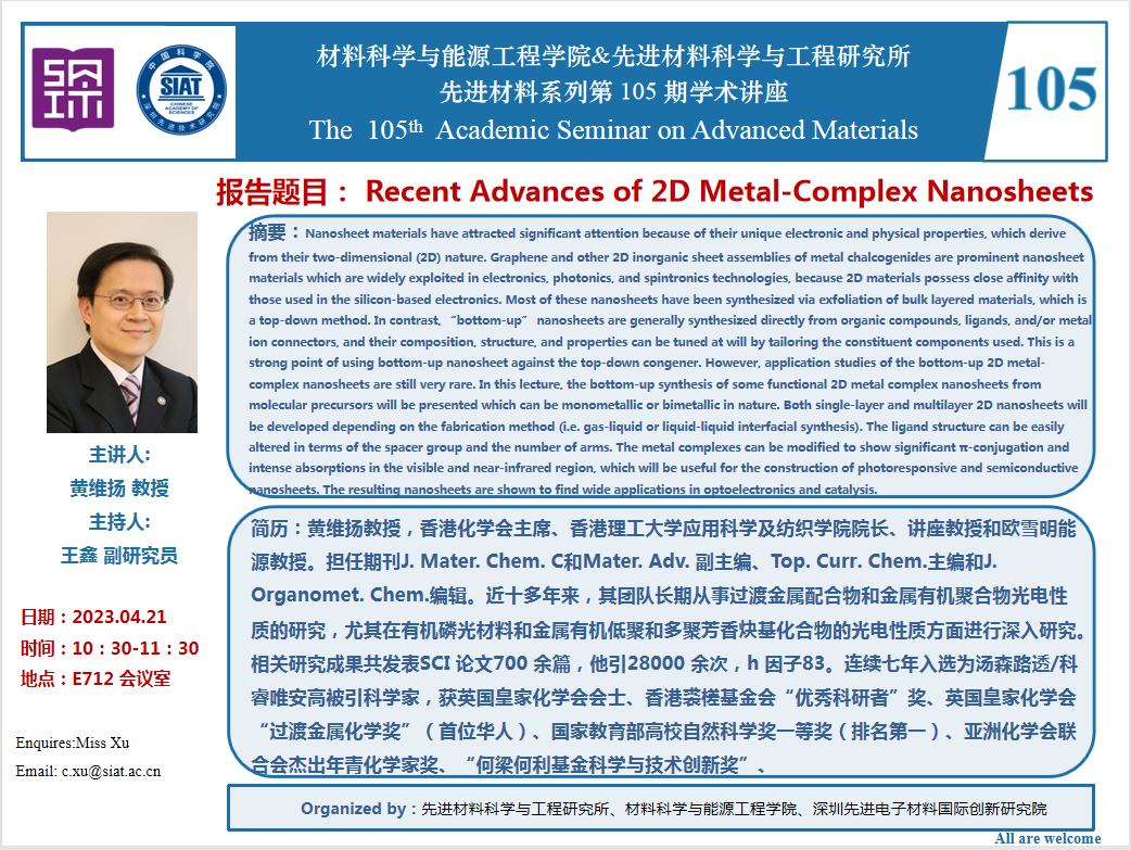 本次讲座邀请了 香港理工大学 黄维扬 教授 带来题为“Recent Advances of 2D Metal-Complex Nanosheets ”的报告。
