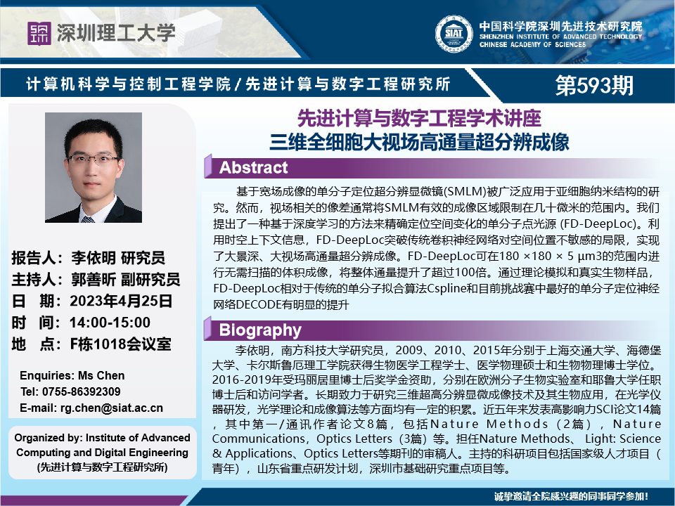 大家好!计算机学院/先进计算与数字工程研究所学术讲座第593期将于4月25日14:00-15:00在F栋1018会议室举行,本次讲座将邀请南方科技大学 李依明 研究员作题为“三维全细胞大视场高通量超分辨成像”的报告。本次报告将由数字所 郭善昕 副研究员主持,诚挚邀请大家参加、学习和交流!