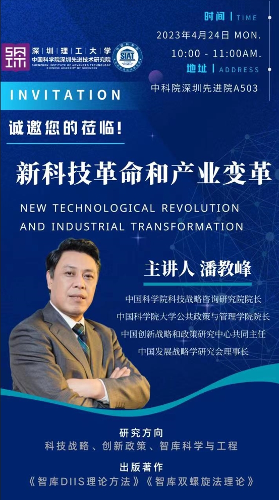 “新科技革命和产业变革”主题报告将于2023年4月24日(周一)10:00-11:00,在A503会议室举行。?届时将邀请中国科学院科技战略咨询研究院潘教峰院长重点围绕科技战略、创新政策等方面进行交流及探讨,诚挚邀请大家准时参加、学习与交流!