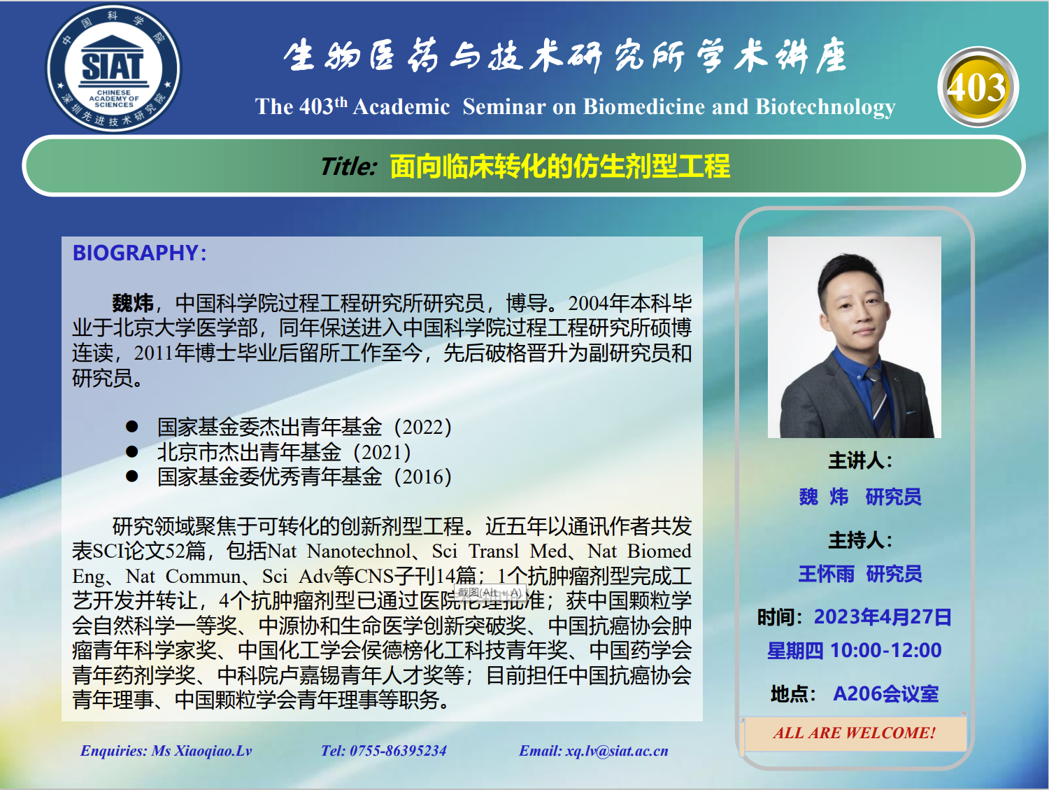 大家好! 医药所第403期学术讲座将于2023年04月27日 星期四 10:00-12:00 A206会议室举行。本次讲座邀请了来自中国科学院过程工程研究所,魏 炜 研究员带来“面向临床转化的仿生剂型工程”的报告。届时,王怀雨 研究员 将主持讲座。