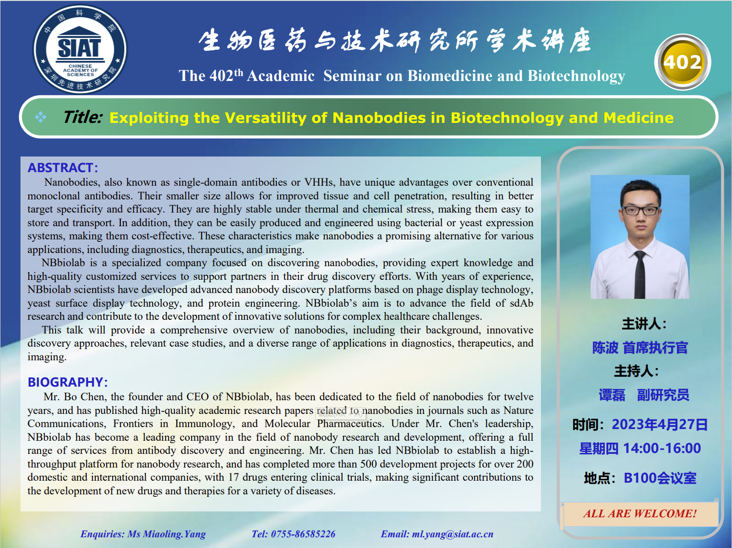 大家好! 医药所第402期学术讲座将于2023年04月27日 星期四 14:00-16:00 B100会议室举行。本次讲座邀请了来自阿帕克生物科技有限公司,陈波 首席执行官带来“Exploiting the Versatility of Nanobodies in Biotechnology and Medicine”的报告。届时,谭磊 副研究员 将主持讲座。