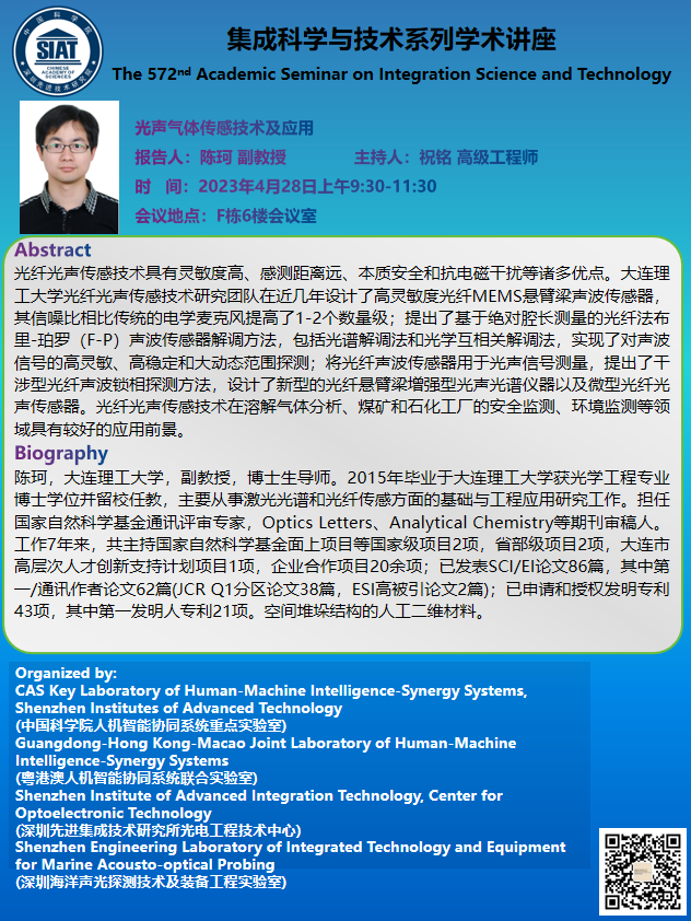 集成所第572期集成科学与技术系列学术讲座将于4月28日(周五)上午9:30-11:30在F栋6楼会议室召开,本次讲座特邀大连理工大学的 陈珂 副教授作题为《光声气体传感技术及应用》的学术报告。
