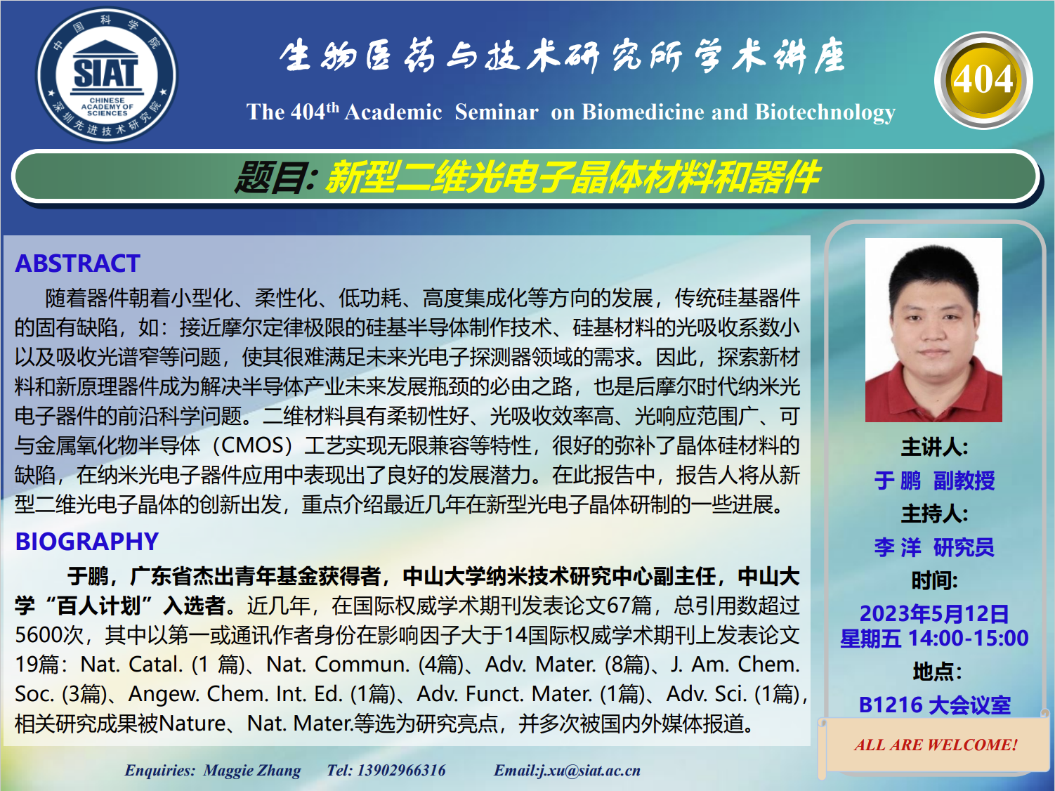 大家好! 医药所第404期学术讲座将于2023年05月12日 星期五 14:00-15:00 B1216大会议室举行。本次讲座邀请了来自中山大学,于鹏 副教授带来“新型二维光电子晶体材料和器件”的报告。届时,李洋 研究员 将主持讲座。