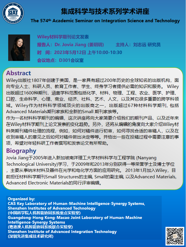 集成所第574期集成科学与技术系列学术讲座将于5月12日(周五)上午10:00-10:30在D301会议室召开,本次讲座特邀Wiley出版社的Jovia Jiang编辑作题为《Wiley材料学期刊论文发表》的学术报告。