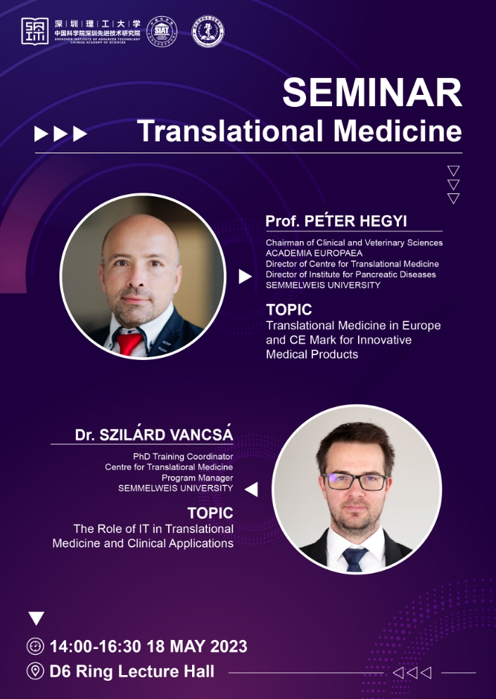 本次研讨会邀请了 欧洲科学院临床与兽医方向主席 Prof.PETER HEGYI 和 塞麦尔维斯大学 Dr. SZILARD VANCSA 分别带来题为“Translational Medicine in Europeand CE Mark for Innovative Medical Products”和“The Role of IT in Translational Medicine and Clinical Applications”的报告。