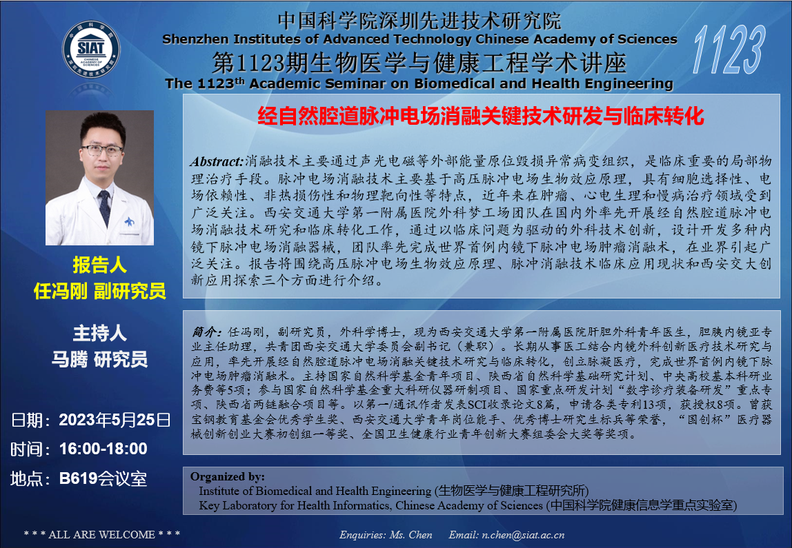本次讲座邀请了 西安交通大学第一附属医院 任冯刚 副研究员带来题为“经自然腔道脉冲电场消融关键技术研发与临床转化”的报告。