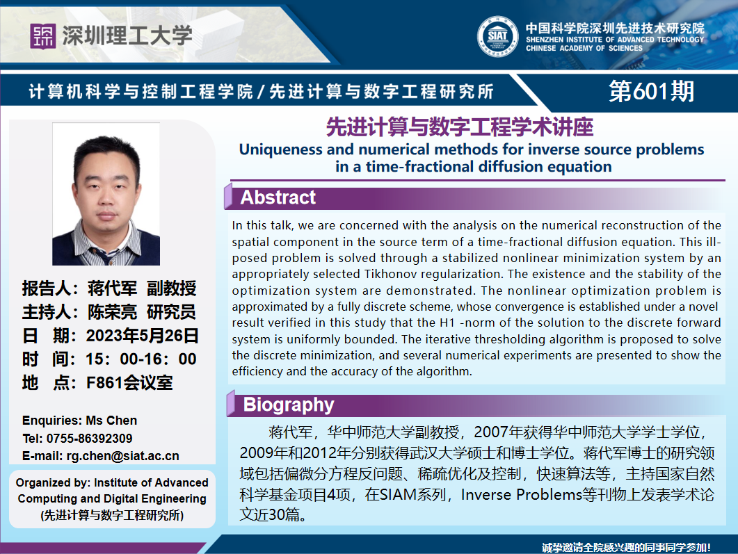 大家好!计算机学院/先进计算与数字工程研究所学术讲座第601期将于5月26日15:00-16:00在F栋F861会议室举行,本次讲座将邀请华中师范大学 蒋代军 副教授作题为“Uniqueness and numerical methods for inverse source problems in a time-fractional diffusion equation”的报告。本次报告将由数字所 陈荣亮 研究员主持,诚挚邀请大家参加、学习和交流!