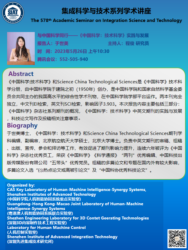 集成所第578期集成科学与技术系列学术讲座将于2023年5月26日(周五)上午10:30召开线上会议,腾讯会议号:552-505-940。本次讲座特邀中国科学杂志社的于世美 编辑作题为《与中国科学同行——<中国科学:技术科学>实践与发展》的学术报告。