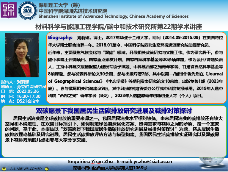 材料科学与能源工程学院/碳中和技术研究所第22期学术讲座将于5月26日(周五)16:30-17:30在D521会议室召开。本次讲座特邀中国科学院西北生态环境资源研究院的刘莉娜 博士作题为《双碳愿景下我国居民生活碳排放研究进展及减排对策探讨》的学术报告。