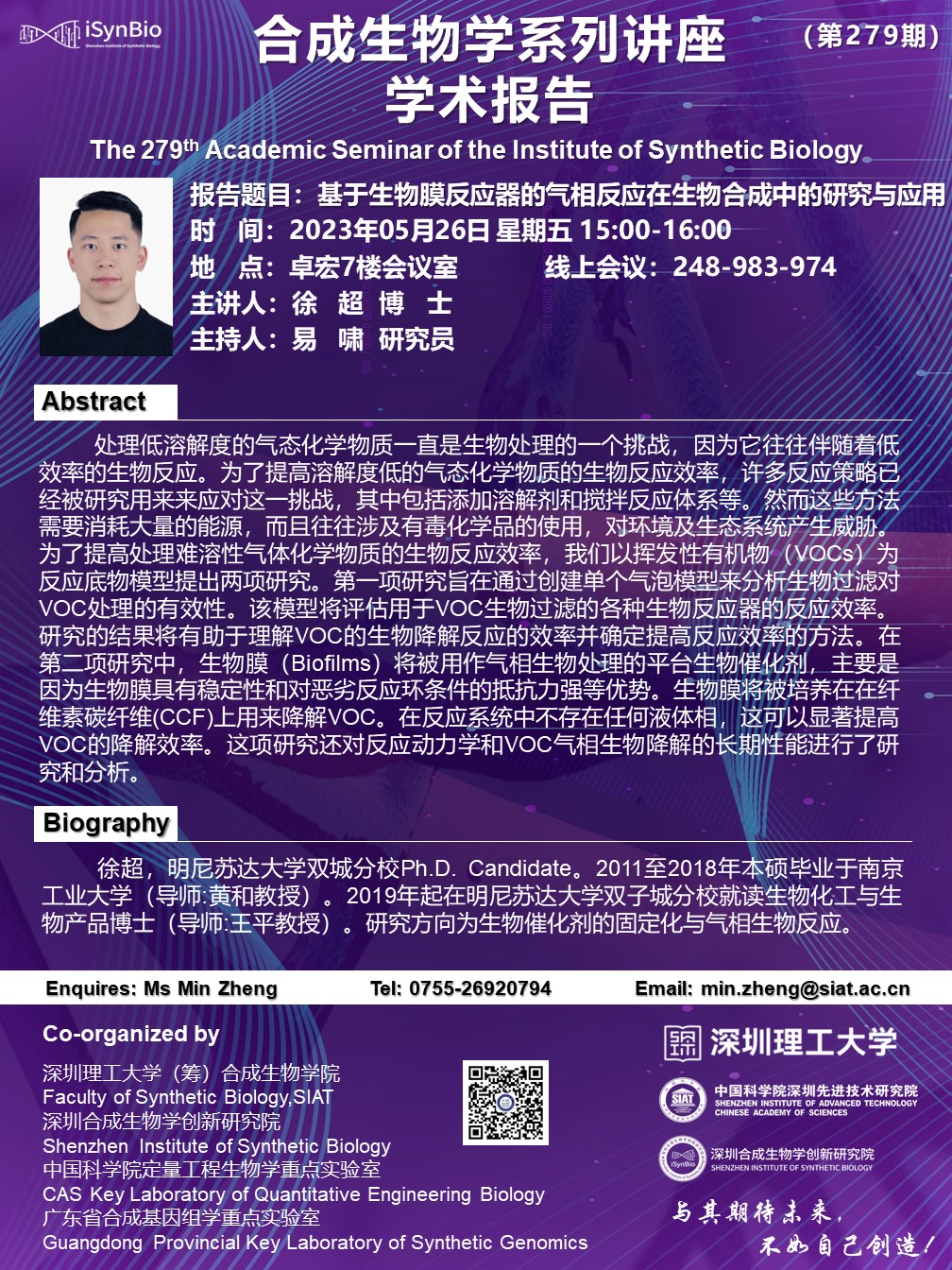 合成所/合成生物学院第279期学术讲座将于 5月26日(星期五)15:00-16:00 在 卓宏大厦7楼会议室 举行。