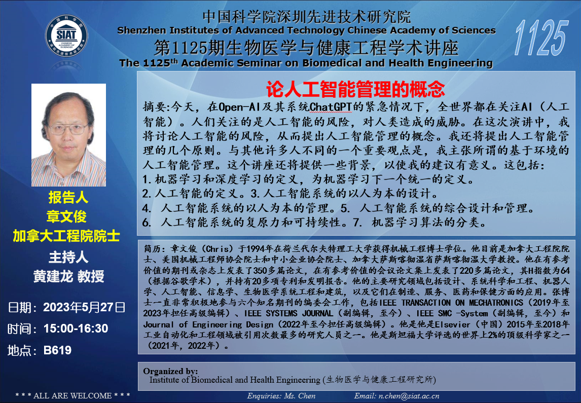 本次讲座邀请了 加拿大工程院院士 章文俊 教授带来题为“论人工智能管理的概念”的报告。