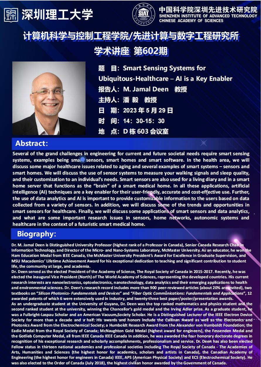 大家好!计算机学院/先进计算与数字工程研究所学术讲座第602期将于5月29日14:30-15:30在D栋603会议室举行,本次讲座将邀请McMaster University,M. Jamal Deen 教授作题为“Smart Sensing Systems for Ubiquitous-Healthcare – AI is a Key Enabler”的报告。本次报告将由计算机学院 潘毅 教授主持,诚挚邀请大家参加、学习和交流!