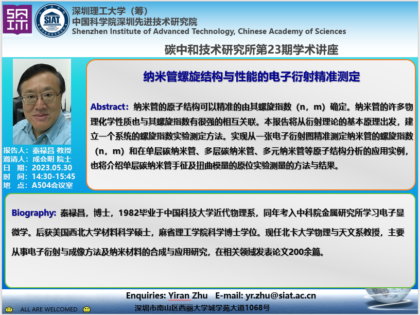 碳中和技术研究所第23期学术讲座将于5月30日(周二)14:30-15:45在A504会议室召开。本次讲座特邀北卡大学物理与天文系教授 秦禄昌作题为《纳米管螺旋结构与性能的电子衍射精准测定》的学术报告。
