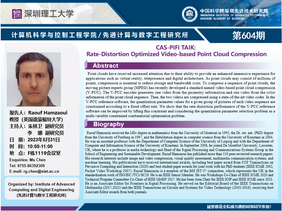 大家好!计算机学院/先进计算与数字工程研究所学术讲座第604期将于5月31日10:00-11:00在F1119会议室举行,本次讲座将邀请英国德蒙福特大学 Raouf Hamzaoui 教授作题为“ Rate-Distortion Optimized Video-based Point Cloud Compression”的报告。本次报告将由数字所 朱林卫 副研究员、李娜 副研究员主持,诚挚邀请大家参加、学习和交流!