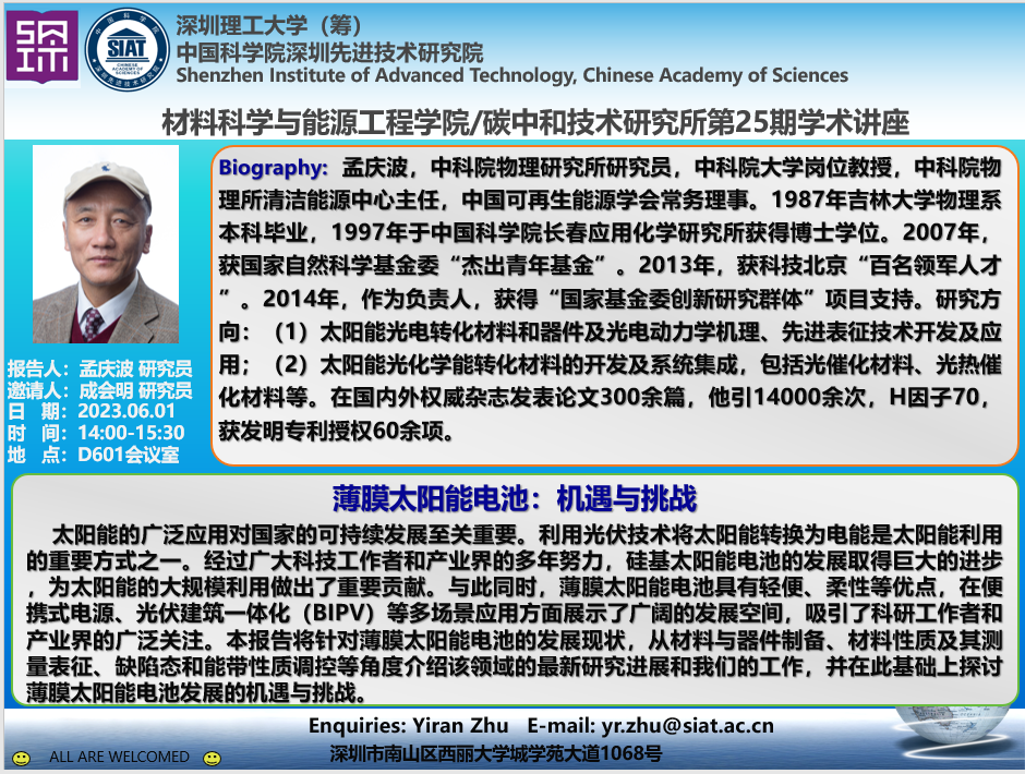 材料科学与能源工程学院/碳中和技术研究所第25期学术讲座将于6月1日(周四)14:00-15:30在D601会议室召开。本次讲座特邀中国科学院物理研究所的孟庆波 研究员作题为《薄膜太阳能电池:机遇与挑战》的学术报告。