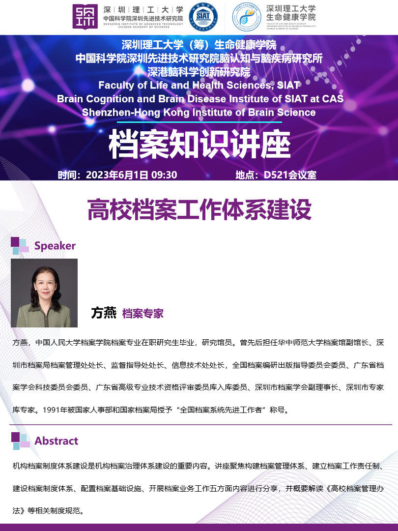为迎接6·9国际档案日,生命健康学院、脑所将于2023年6月1日09:30,地点:D521会议室举办档案知识讲座。