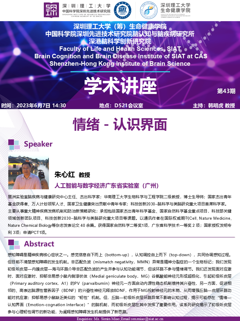 生命健康学院、脑所将于2023年6月7日14:30,地点:D521会议室举办第43期学术讲座。